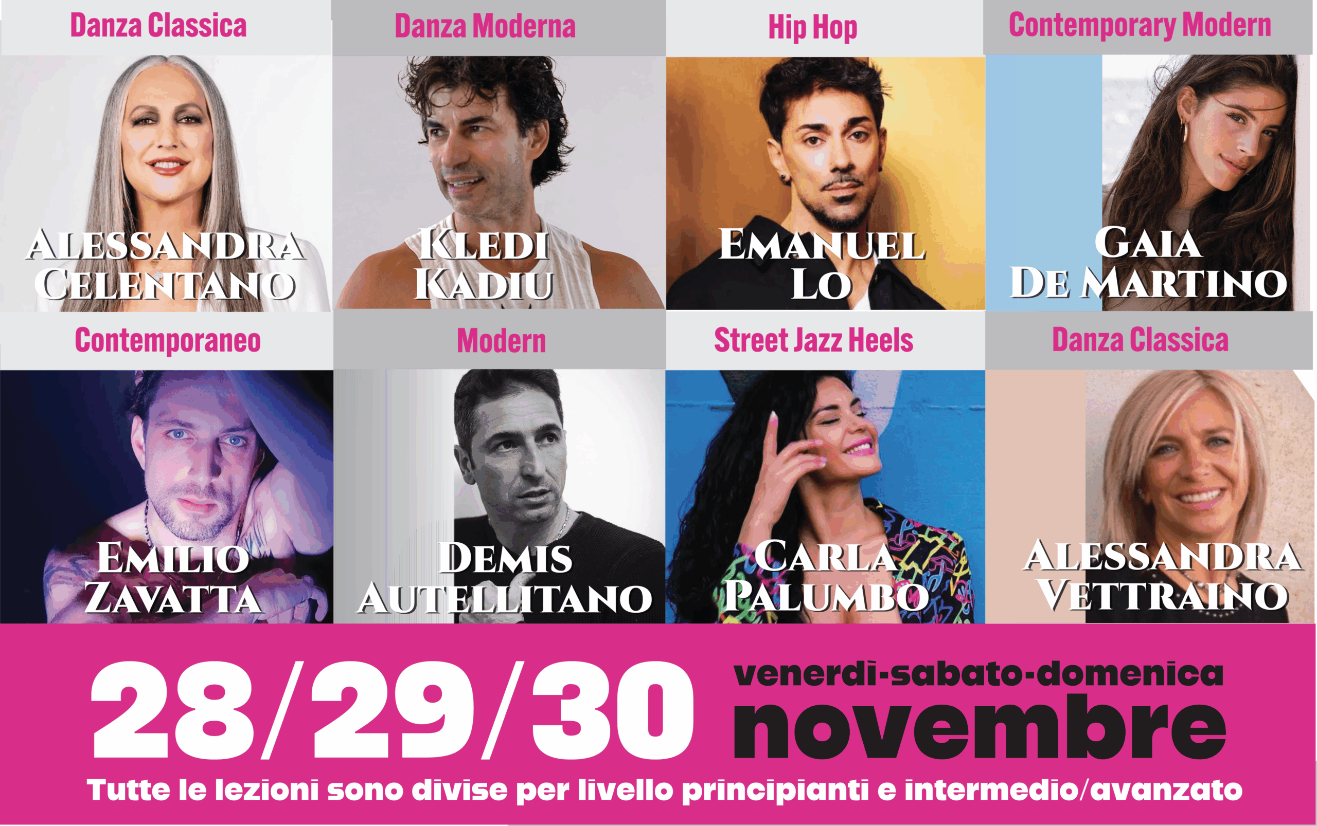 Gli ospiti maestri che parteciperanno allo stage saranno: Alessandre Celentano, danza classica / Emanuel Lo, hip-hop / Kledi Kadiu, modern / Gaia De Martino, contemporary modern / Carla Palumbo,heels e street jazz / Emilio Zavatta, contemporaneo e naturalmente i due Direttori Artistici: Demis Autellitano, modern e Alessandra Vettraino, classico.