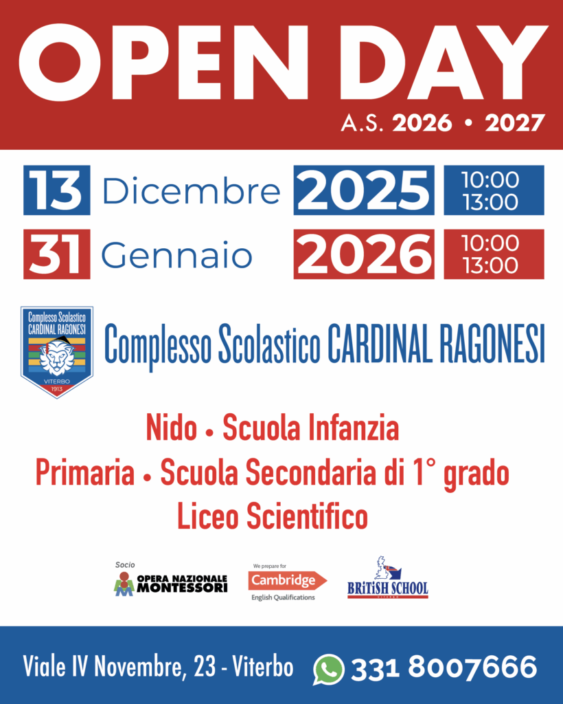 Sabato 13 dicembre 2025 e sabato 31 gennaio 2026 sarà possibile informarsi rispetto alle opportunità formative offerte dall’Istituto recandosi presso i locali del Complesso Scolastico Cardinal Ragonesi, sito al n. 23 di Viale IV Novembre, Viterbo.